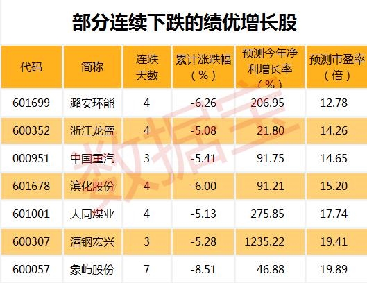 值得注意的是,50只连续下跌且累计跌幅超过5%个股中,7只个股按照机构预测(5家以上机构预测)的今年年度净利测算市盈率低于20倍且净利正增长,潞安环能(601699)市盈率最低,仅为12.78倍。