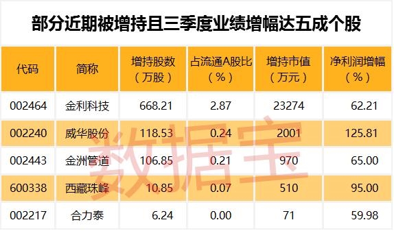 结合三季度业绩预告来看,威华股份(002240)、西藏珠峰(600338)、金洲管道(002443)等公司净利润同比大幅增长,增幅分别高达125.81%、95.00%、65.00%。这些绩优且被增持的个股,或是股价已经被低估,或是未来潜力较大,值得关注。