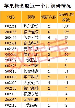 除无线充电与增强现实概念外,苹果概念股也将间接受益。数据宝统计显示,近一个月来, 15只苹果概念股迎来了机构调研,其中信维通信、蓝思科技(300433)机构调研频率最高,近一个月机构调研达6次。
