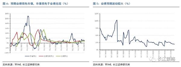 其次,在计算的过程中,我们采用了未来一年的实际业绩增速代替未来一年的预期业绩增速,来计算业绩预期增速。这主要是由于消费股业绩预期增速会有显著的波动性,并且由于分析师业绩调整的滞后性,通常会在年初的时候出现极值。不过,我们认为,也正是由于业绩预期存在偏差的原因,才使得业绩增速相对于股价波动有一定的领先性。