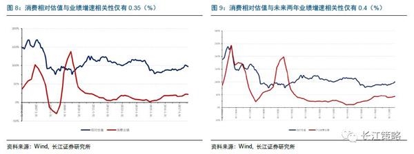 首先我们计算了消费股的相对估值与其业绩增速的关系,发现历史上这二者之间并没有显著的相关性,2005年以来消费股的相对估值与其业绩增速相关性仅有0.35,尤其是在2008年之后,其相关性更不明显。我们也尝试了不同领先滞后期的相关关系,发现其并不存在显著的领先和滞后关系。