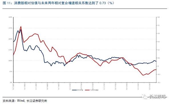 针对消费相对估值的影响这一问题,我们进行了一系列的研究,最终的结论是,当消费股表现出长期的相对业绩的可持续性时,投资者愿意给予消费股估值溢价。体现在消费股的相对估值与其未来两年的相对业绩增速有很高的相关性。换句话说,对于消费股,投资者愿意给予其可持续性溢价。
