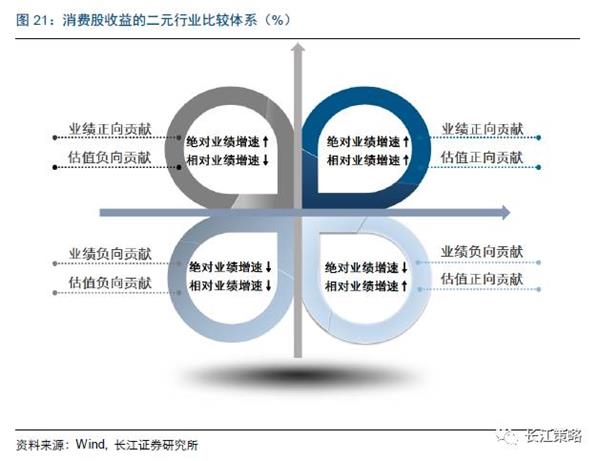 据此,我们认为,消费股收益可以建立起如下的二元行业比较体系:绝对业绩增速决定业绩的贡献,长期的相对业绩增速决定相对估值的贡献。
