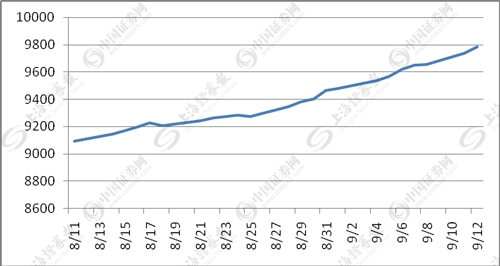 截至9月12日,两市两融余额为9783亿元,其中,沪市融资余额为5750亿元,占流通市值比为2.07%;深市融资余额为3986亿元,占流通市值比为2.37%;两市融资余额9736亿元,占流通市值比为2.18%。而一个月前作为本轮行情调整低点的8月11日,两市两融余额为9093亿元。也就是说,最近一个月两市两融余额增加了690亿元,增幅为7.59%,在22个交易日中日均增加31.36亿元。