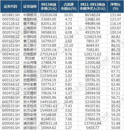 再进一步统计可以发现,目前两融余额占流通市值比在10%以上,同时最近一个月两融余额净增比超过20%的有13只个股。两融资金短期内集中深度介入,或许相关个股被杠杆“撬起”已指日可待。