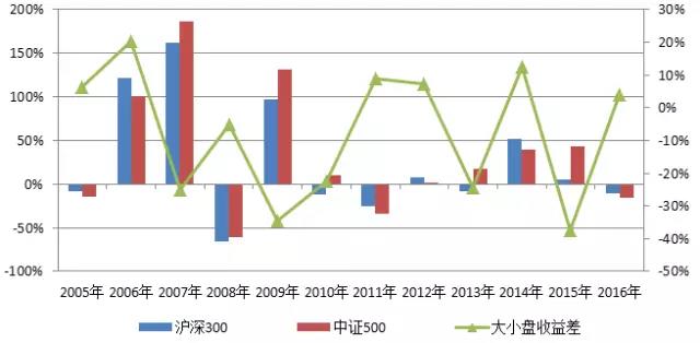 图:A股历年沪深300(大盘)、中证500(小盘)指数收益率