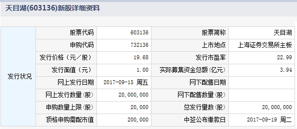 天目湖9月15日发行申购上限2万股