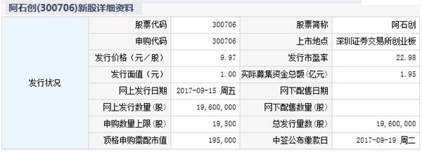 根据交易所公告,福建阿石创新材料股份有限公司于2017年9月15日进行网上申购。本次发行新股数量为1,960万股,网上发行1,960万股,占本次发行总量的100%。本次发行股份全部为新股,不安排老股转让。