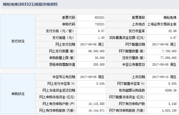 根据交易所公告,浙江梅轮电梯股份有限公司于2017年9月15日起在上海证券交易所主板上市交易。