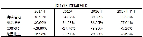 确成硅化的收入结构中,白炭黑的收入占比超过了99%,其毛利率2014-2016年以及2017年上半年分别为36.93%、34.87%、39.37%和35.55%,招股说明书中与同行业比较中,仅仅比较了速动比率、流动比率、资产负债率等,并没有列出同行业的毛利率。记者通过整理招股说明书列出同行业的年报等信息,综合分析发现,确成硅化白炭黑毛利率远高于同行。