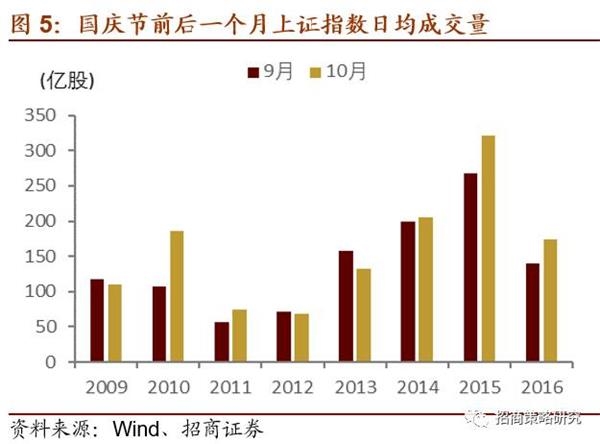 从市场的交易情况来看,国庆节后一周的日均成交量均超过国庆节前一周,且10月的日均成交量再大多数年份超过9月。所以就概率而言,国庆节后市场的成交很大可能会更加活跃,也说明很多投资者是看好十一后市场的。