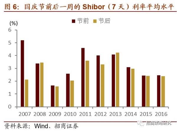 从市场资金面来看,2012年以前,7天Shibor利率在国庆节前一周普遍高于国庆节后一周的平均水平,也就是说资金成本在国庆节前倾向于提升,主要因为国庆期间居民选择外出旅行,短时间内的资金需求增加。但是,近几年资金成本的国庆节效应有所减弱,国庆节前一周利率并没有明显变化,这就可以减弱央行对货币市场的短期干预,有利于货币政策稳健有效。