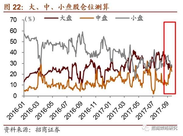 基金持仓方面,股票型和混合型基金整体仓位(9月21日)分别较前一周(9月14日)增加0.27%和0.5%至89.34%和81.13%。大盘股仓位较前一周增加2.22%至28.21%;中盘股仓位较前一周增加0.71%至22.73%,小盘股仓位较前一周减少2.45%至27.9%。