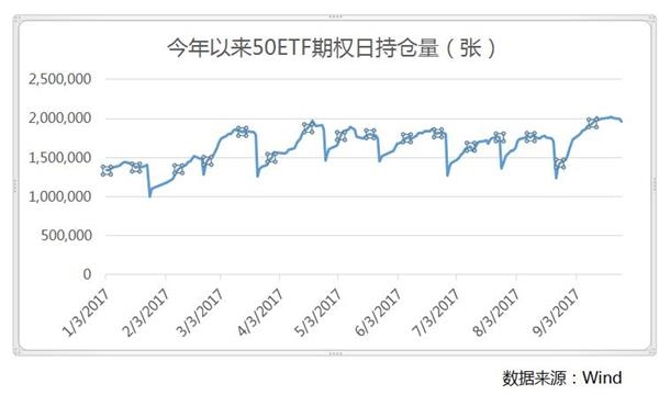 9月18日(上周一)开始,50ETF期权持仓量连续5个交易日站上200万张。本周前两个交易日,期权持仓量也都维持在199万张以上。