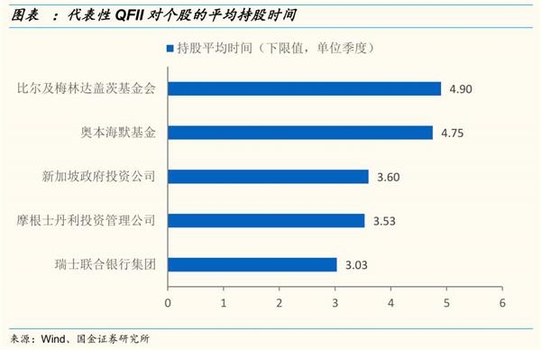 2)作为长期价值投资者,QFII对个股持有时间较长,平均持股时间在1年以上。我们统计了2010年以来五家不同类型且具有代表性的QFII对个股的持有时间,发现这五家机构对个股的平均持股时间为1年。由于数据来源于上市公司披露的十大股东数据(不在上市公司十大股东名单中的QFII没有进入统计范围),所以统计的持股时间会低于实际值,考虑到低估的情况,我们预计QFII整体平均持股时间在1年以上。