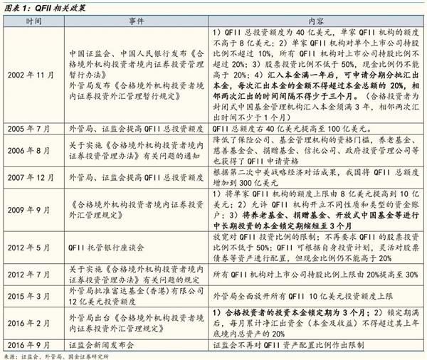 一、自2002年QFII制度在我国推行以来,QFII投资额度不断扩容,各项限制陆续放宽。QFII制度推行15年以来,QFII投资额度不断扩容,截止目前,286家QFII获批投资额度达939.9亿美元。同时,我国对QFII的限制不断放宽,目前单个QFII投资额度上限被取消,投资本金锁定期由1年缩短为3个月,资产配置比例也不受限制。