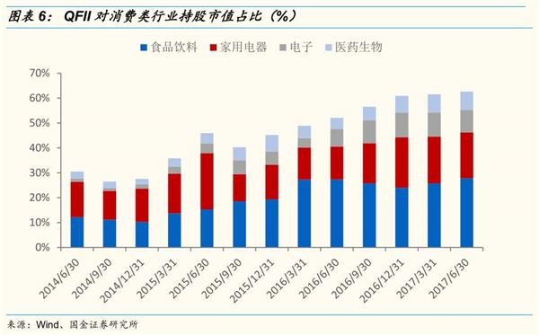QFII持股集中在消费类行业(如:食品饮料、家电、医药和消费电子等),占比超过60%。由于荷兰安智银行、法国巴黎银行、新加坡华侨银行分别是北京银行、南京银行、宁波银行的原始股东,我们把这三家公司对这三家银行的持股数据剔除后,我们发现QFII持股行业集中在消费类行业,持股市值占比超过60%。消费类行业是我国具有本土优势的行业,同时白酒等细分行业还具有一定的全球稀缺性,配置消费类行业契合QFII的全球资产配置策略。