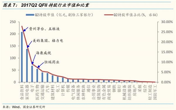 3)QFII持股集中在消费类行业(食品饮料、家电、医药和消费电子等),占比超60%,其中龙头公司获青睐。消费类行业是我国具有本土优势的行业,同时白酒等细分行业还具有一定的全球稀缺性,重点配置消费类行业契合QFII的全球资产配置策略。截止2017Q2,QFII对食品饮料、家电、电子、医药行业持股市值占比分别为27.82%、18.43%、9.07%、7.34%(合计为62.66%)。其中个股方面,行业龙头公司获QFII青睐,如:贵州茅台、美的集团、五粮液、海康威视、格力电器、恒瑞药业等。