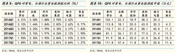 QFII对家电、白酒等行业的重仓个股进行了一定的减持,如:格力电器、美的集团、青岛海尔、贵州茅台、五粮液、洋河股份等。但总体来看,QFII对这些个股的持股规模依然较大(持股市值均在10亿以上),其中对贵州茅台、美的集团持股市值高达111.8亿元和78.8亿元。