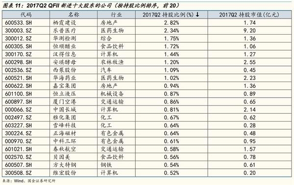 2017Q2 QFII新进十大股东的公司有50家,按持股比例排序,前20的公司为:栖霞建设、乐普医疗、华测检测、恒顺醋业、汉得信息、安琪酵母、西泵股份、华海药业、嘉宝集团、恒立液压、厦门空港、中国长城、雅化集团、雪峰科技、正海磁材、中科三环、春秋航空、贝因美、方大特钢、维宏股份。