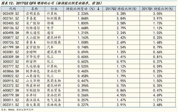 2017Q2 QFII继续增持的公司有45家,按持股比例变动排序,前20的公司为:启明星辰、多喜爱、省广股份、信维通信、烽火通信、天山股份、鲁泰A、星宇股份、金螳螂、万华化学、新宙邦、久远银海、桃李面包、山东海化、山大华特、伟星新材、百联股份、水井坊、鼎汉技术、海大集团。
