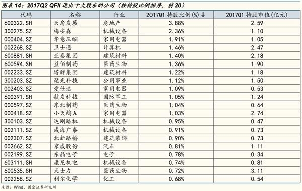 2017Q2 QFII退出十大股东的公司有85家,按持股比例排序,前20的公司为:天房发展、梅安森、华意压缩、卫士通、亚泰集团、益佰制药、塔牌集团、聚光科技、爱仕达、航发科技、东北制药、小天鹅A、达刚路机、威海广泰、北新路桥、京威股份、东晶电子、康尼机电、天士力、利尔化学。