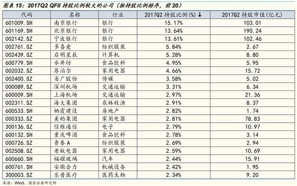 1)QFII持股市值1144.7亿,占流通市值0.28%。其中银行类QFII持股市值最大,占QFII总市值比重达50%。截止2017Q2,以6月30日收盘价计算,QFII持股市值达1144.7亿元,占A股流通市值的0.28%。从QFII的类型来看,银行类QFII持股市值最大,2017Q2共持有572.4亿市值,占比50%。第二梯队中,投资公司(包括资管、基金公司等)持股市值为320.3亿元,占比28.0%;政府机构投资机构(包括主权财富基金、央行等)持股市值为204.3亿元,占比17.8%。