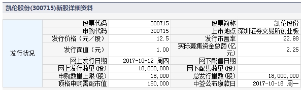 根据交易所公告,江苏凯伦建材股份有限公司于2017年10月12日进行网上申购。本次公开发行股票总数量1,800万股。网上发行1,800万股,占本次发行总量的100%。本次发行股份全部为新股,不安排老股转让。
