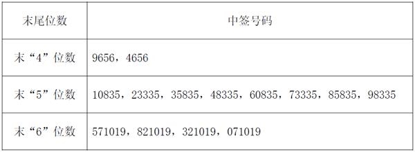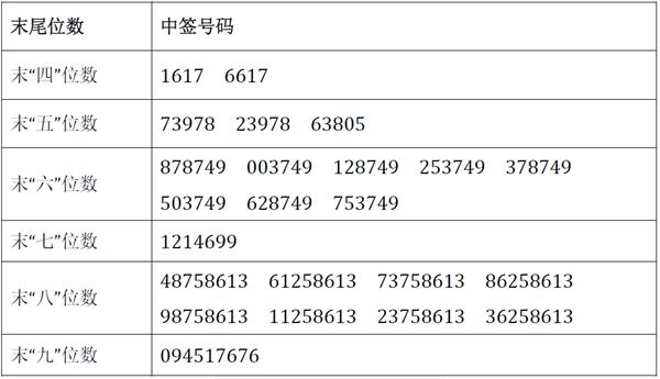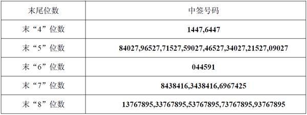 凡参与本次网上定价发行的投资者持有的申购配号尾数与上述号码相同的,则为中签号码。中签号码共有28,503个,每个中签号码只能认购1,000股上海晶华胶粘新材料股份有限公司A股股票。