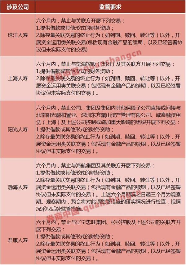 例如,渤海人寿被禁止与海航集团及其关联方开展上述交易,君康人寿被禁止与辽宁忠旺、杉杉控股及其关联方开展关联交易。6个月之后就高枕无忧了吗?还有3个月观察期。观察期内,保监会将对此项监管措施的落实情况进行检查,视情况采取后续监管措施。
