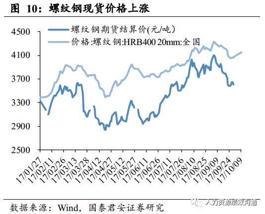 高炉开工率环比上升,螺纹钢价格上涨。(1)9月23日至9月29日,高炉开工率为75.14%,环比上升0.19%。(2)10月9日,螺纹钢(HRB400 20mm)价格4156元/吨,环比上涨1.81%;线材价格4446元/吨,环比上涨1.6%;热轧卷(板)价格4310元/吨,环比上涨2.99%。(3)期货方面价格,螺纹钢期货结算价格为3733元/吨,环比上涨3.61%;热轧卷(板)期货价格4030元/吨,环比上涨3.79%。(4)库存方面,10月8日,螺纹钢库存为453.74万吨(上周为418.19万吨),环比上涨8.5%,线材库存为134.87万吨(上周为117.52万吨),环比上涨14.76%,热轧卷(板)库存为215.26万吨(上周为193.26万吨),环比上涨11.38%。
