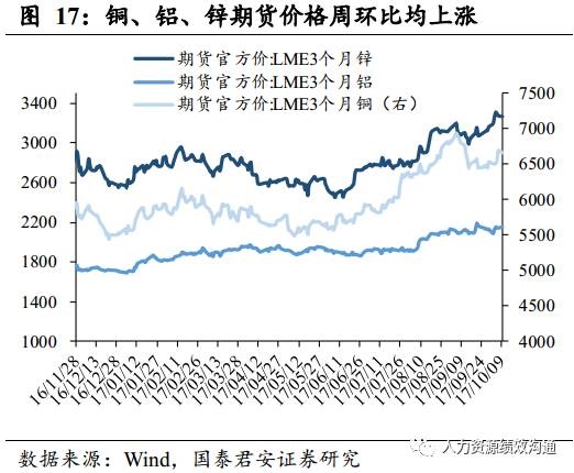 铜、铝、锌价格环比均上涨,阴极铜库存继续下降。(1)本周铜、铝、锌金属价格均上涨,截至10月9日,LME3个月铜期货价格环比上涨2.4%,LME铜现货价格较上周上涨2.35%;LME3个月铝期货价环比上涨3.21%,LME铝现货价格较上周上涨3.29%;LME3个月锌期货价环比上涨2.28%,LME锌现货价格较上周上涨3.06%。(2)库存方面,截至9月29日,本周阴极铜库存较上周环比下降27.01%(上周环比下降15.25%),铝库存较上周上升3.71%(上周环比上升1.33%),锌库存较上周下降4.03%(上周环比下降3.5%).