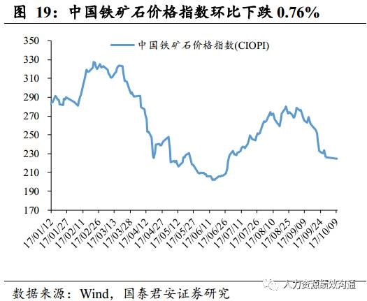 铁矿石价格下跌。受钢厂冬季限产措施影响,9月30日至10月9日,中国铁矿石价格指数(CIOPI)下降至224.58,环比下跌0.76%。其中,国产铁矿石指数为228.2,环比下跌0.27%;进口铁矿石指数为224.03,环比下跌0.84%。