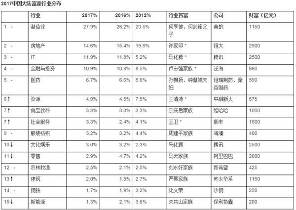 IT和金融投资则位列第三、第四位,且富豪人数与去年相比,均略有上升。