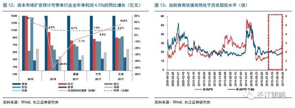2016年以来,IPO持续加速,资本市场将迎来第四轮扩容。上市公司数量增加丰富券商业务空间,夯实券商ROE底部。市场扩容将极大丰富券商业务,如股票质押、投行业务、经纪业务,同时,以融资融券、股票质押、券商资管为代表的创新业务已经发展成熟,使本轮扩容后业务具备更多可开发空间。根据长江非银研究组的测算,短期来看,2017年行业将恢复正增长,中性假设下,行业实现净利润1290亿元,同比增长4.5%。