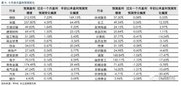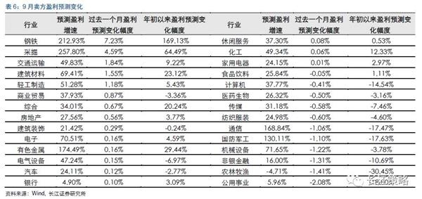 此外,从盈利预期来看,9月份周期股盈利进一步上调,钢铁、采掘盈利预测位于所有行业前两位,上调幅度均比较明显,除这两个行业之外,其他大部分行业业绩预期变动幅度均不明显。因此我们预计,在三季度业绩有望继续超预期的情况下,未来周期股业绩预期仍然会持续上调,带来周期股景气持续向好。