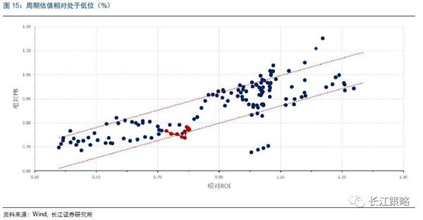 从估值的角度来看,目前周期整体的估值仍然处在比较低的位置。根据我们建立的相对PB-ROE估值体系(详见我们前期的行业比较报告《周期股估值贵了么?——八月行业配置报告》),虽然周期股的PB前期有所上升,但是相对于当前盈利来看,目前周期股估值情况仍然处于比较低的状态,并没有出现显著的上升。