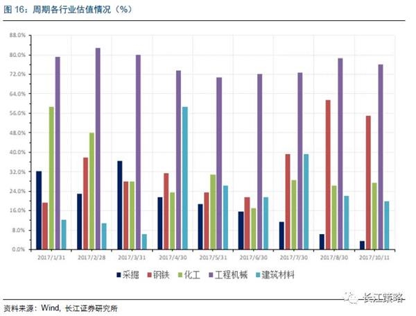 分行业来看,仅有钢铁行业估值出现了大幅度的上升,而采掘的估值有了进一步的下行,目前周期股行业估值从低到高排序为:采掘、建材、化工、钢铁、机械。