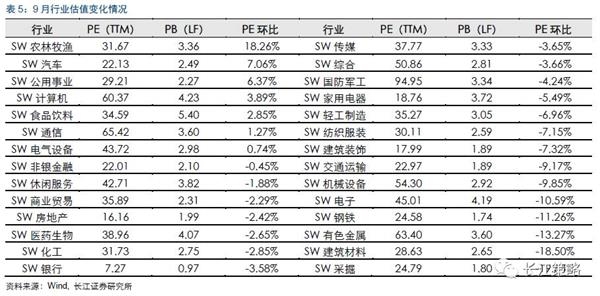 从月度变化来看,截至9月29日,除农牧、汽车、公用事业、计算机、食品饮料、通信、电气设备等7个行业外,其他申万一级行业估值均较8月末环比下跌。其中,农牧、汽车、公用事业估值提升位列前三位,分别较8月末大幅上升18.26%、7.06%与6.37%,此外,计算机、食品饮料、通信、电气设备估值分别较8月末提升3.89%、2.85%、1.27%、0.74%。而9月估值明显下降的行业有采掘、建材、有色金属、钢铁等典型周期品行业及电子,分别较8月末大幅下降19.64%、18.50%、13.27%、11.26%及10.59%。值得关注的是,钢铁、电子行业当前估值已明显低于历史均值水平。