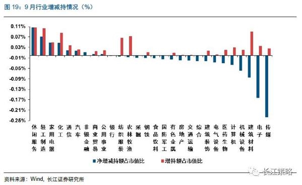 分行业来看,28个申万一级行业中9月整体处于净增持状态的仅有9个。而传媒、电子、建材、机械设备、计算机、医药生物、电气设备、建筑装饰、综合、交通运输、房地产、有色、国防军工、食品饮料、钢铁、采掘、农牧、纺服、银行等行业出现单月净减持情况,其中传媒行业净减持额占总市值比重最高,达到0.24%,另外电子、建材、机械设备行业净减持额占市值比重分别达到0.16%及0.08%、0.06%。其次,计算机、医药生物、电气设备等行业净减持额占市值比重分别达到0.04%、0.03%、0.03%。从净增持情况来看,休闲服务、轻工、家电、化工、通信、汽车、非银金融、商业贸易、公用事业等9个行业出现净增持,且除商业贸易和公用事业外,其他7个行业净增持额占总市值比重均在1个BP以上。