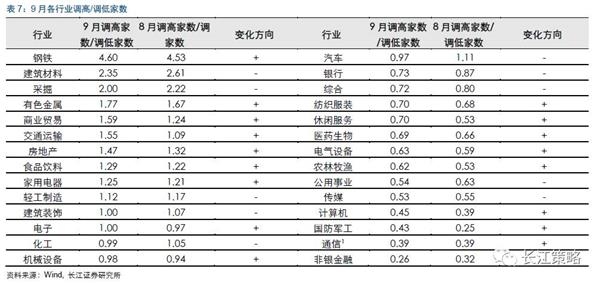 从行业研究员调整情况来看,钢铁、建材、采掘、有色等典型周期品行业及商贸、交运、地产、食品饮料、家电等行业9月研究员预测净利润调高家数/预测净利润调低家数比例较高,均在1.20以上,其中,建材、采掘调高/调低比例较8月有所下降,而钢铁、有色、商贸、交运、地产及食品饮料、家电行业该比例较8月有所上升。此外,9月非银、通信、国防军工、计算机等行业的调高评级相对家数仍持续较低。