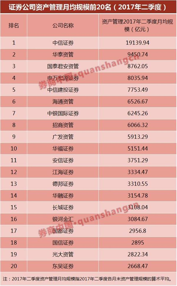 今年二季度,10家券商的资产管理月均规模超过5000亿元。其中,中信证券资产管理月均规模稳居榜首,约1.91万亿元。紧随其后的是华泰资管、国泰君安资管、申万宏源证券和中信建投证券,月均资管规模均在7500亿元以上。前20强中,10家券商月均资管规模低于3000亿元,缩水明显。