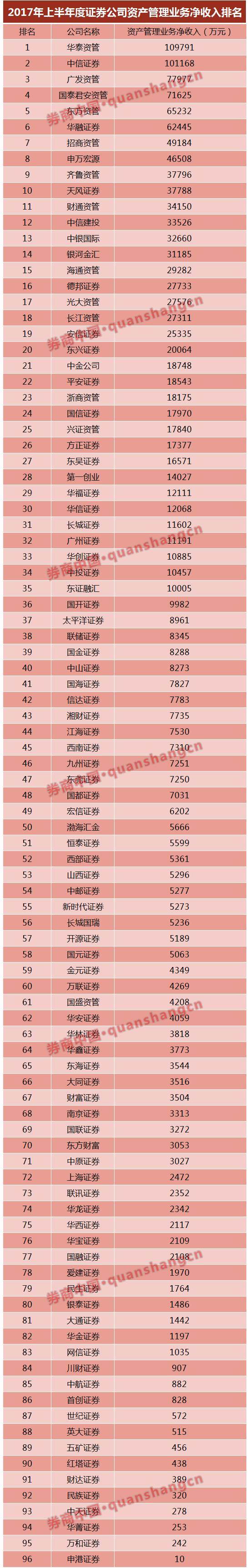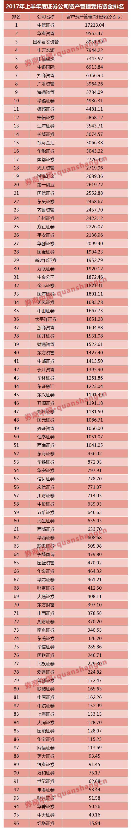 客户资产管理受托资金排名则显示,有的公司撑死,有的公司饿死。数据显示,今年上半年产管理受托资金最大的券商为中信证券,规模高达17213.04亿元,高出第二名9553.47亿元规模的华泰资管7659.57亿元;而资产管理受托资金最小的红塔证券仅15.94亿元。