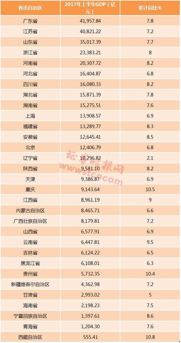 GDP(国内生产总值)是反映各省及直辖市总体实力的重要指标。国家统计局数据显示,今年上半年GDP跨入万亿的省份或直辖市多达14个。2017年上半年,广东省以41957.84亿元的GDP总值暂列首位,同比增速为7.80%;GDP总值最低的是西藏自治区,其今年上半年GDP总值为555.41亿元。尽管西藏自治区GDP总值较低,但其增速高达10.80%,是今年上半年GDP增速达到两位数的3个省份或直辖市之一,剩余两个分别为重庆市、贵州省,两者GDP增速为10.50%、10.40%。今年上半年GDP增速最低的是辽宁省,仅为2.10%。
