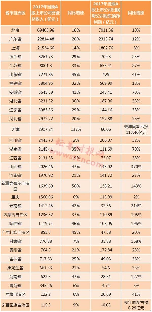 从当地上市公司净利润总额来看,北京市同样排名第一,达7911.36亿元,同比增长10%。广东省与上海分列二三位,分别为2315.74 亿元和1802.76亿元。