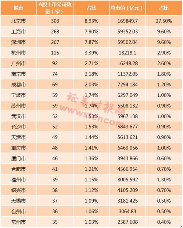 前20位城市上市公司总数达1779家,总市值约40.66万亿元,占比均超过A股总数的一半。