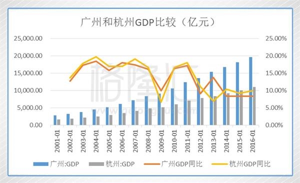 2016年广州市的GDP是19611亿元,杭州市的GDP是11050亿元,杭州大约是广州的55%,但是看增速,广州的GDP同比增长8.2%,而杭州是9.5%。广州的发展已属好的,只是杭州发展得更好,自2004年起杭州的增速都快于广州,而且2016年还有继续扩大倾向。
