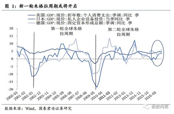 全球可能处于新一轮朱格拉周期的起点上。朱格拉周期是期限在8到10年的周期性波动,主要的驱动因素是设备更新和资本开支。21世纪以来全球已经经历了两轮朱格拉周期,第一轮是从2002年初到2009年,第二轮是2009年到2016年中。今年可以看到美德日韩的设备投资增速回升,全球主要经济体或处于新一轮朱格拉周期的起点上。