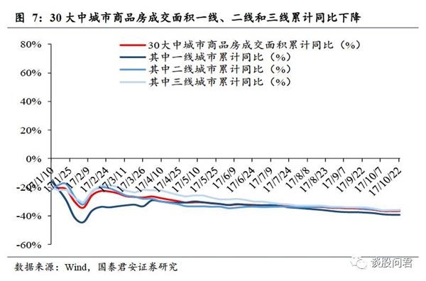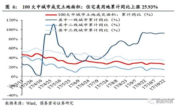 地产整体销售同比下降。在各地房地产政策如限售、上调房贷利率的调控下,商品房销售持续降温。(1)国君地产组以全国40大中城市为样本,构建了一手房销量指标。环比:整体环比升11%,其中一线上升24%,二线上升10%,三线上升7%。同比:整体同比降18%,其中一线降43%,二线升3%,三线下降22%。本周与2016年全年周均比:整体降48%,其中一线降50%,二线降50%,三线降48%。二手房销量:本周环比上升24.2%,同比下降56.8%。(2)最近一周,100大中城市成交土地面积:住宅类用地累计同比上涨25.93%,其中一线城市累计同比上涨92.40%,二线城市累计同比上涨14.61%,三线城市累计同比上涨33.71%(3)30大中城市商品房成交面积累计同比下降36.61%,其中一线下降39.22%,二线下降35.92%,三线下降36.23%。
