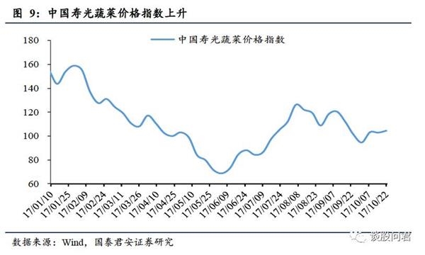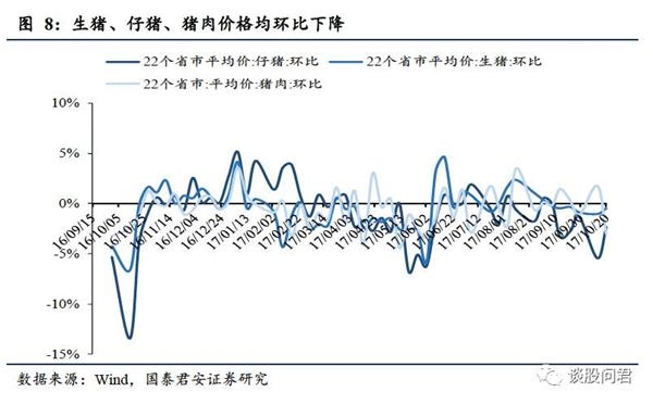 节前猪肉价格下跌,鸡肉、蔬菜价格上升。(1)10月14日至10月20日,猪肉价格方面,22个省市仔猪价格31.96元/千克,环比下跌2.32%。生猪价格14.18元/千克,环比下跌0.49%,猪肉价格21.01元/千克,环比下降3.09%。受环保政策以及目前利润下降导致养殖户退出影响,预计未来猪价会有所回升。(2)10月13日至10月19日,36城市平均鸡肉零售价为11.06元/公斤,环比上涨0.18%。(3)10月16日至10月22日,中国寿光蔬菜价格指数环比上涨至104.38,环比上涨1.57%。